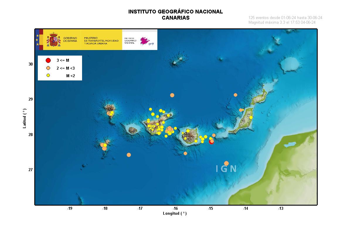 A lo largo del mes de junio se ha localizado un total de 126 terremotos volcanotectónicos en el área de las Islas Canarias, la mayor parte de ellos en la zona central del Archipiélago. La magnitud máxima, 3,3(mbLg), corresponde a un terremoto con epicentro en el mar a unos 40 km al Este de la isla de Gran Canaria. Únicamente un terremoto ha sido sentido por la población durante este periodo, se trata del sismo superficial ocurrido el día 4 de junio a las 13:29h (UTC) en la zona de Cumbre Vieja (La Palma) y que fue sentido en numerosas poblaciones de la isla, alcanzando intensidad máxima IV (EMS-98) en Las Manchas (Los Llanos de Aridane).