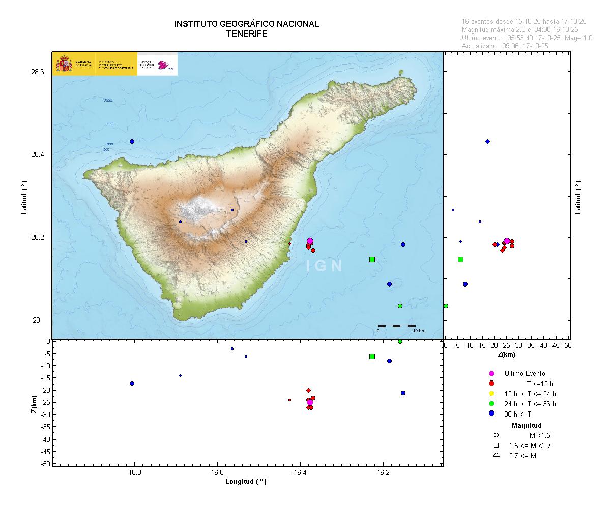 A las 22:26 UTC de ayer 16 de octubre, se comenzó a registrar una serie de terremotos de origen puramente volcanotectónico en la isla de Tenerife. Estos sismos se han localizado en la costa de la Fasnia, a una profundidad media de 25 km bajo el nivel del mar y con magnitudes entre 0.8 y 2.2 mbLg. Hasta este momento, se han detectado 15 terremotos de los cuales se han podido localizar 9.