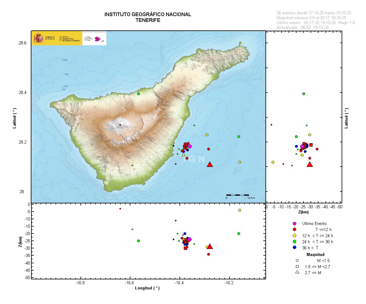 Continúa la actividad sísmica en la costa de Fasnia/Arico. Desde el 16 de octubre a las 22:26 UTC hasta ahora se detecta actividad sísmica cerca de la costa de Fasnia y Arico a una profundidad media de 25 km. Se han detectado unos 55 terremotos de los que se han podido localizar 30. Estos terremotos presentan una magnitud de entre 0.8 y 2.6 mbLg. Desde el IGN se está haciendo seguimiento de la evolución de esta actividad. Además, el sábado 18 de octubre se produjo un terremoto de magnitud 3.4 más alejado de la costa y a una profundidad de 29 km que fue sentido levemente por la población.