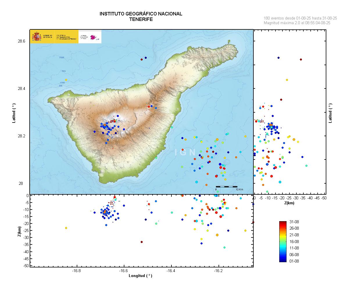 La mayor parte de la actividad sísmica ha tenido lugar en el interior de la isla de Tenerife, donde se han localizado 122 terremotos de magnitudes comprendidas entre -0.3 y 1.8 (mbLg). Destacan dos enjambres de actividad microsísmica en esta isla a lo largo del mes. El primero comenzó a las 2:00 (UTC) del día 7 de agosto en la zona de Las Cañadas del Teide, al suroeste de Pico Viejo y estuvo activo durante más de tres horas en las que se detectaron más de 700 eventos de muy baja magnitud (mbLg<1.0). Veintidós eventos de esta serie han podido ser localizados, todos ellos están situados a unos 10-13km de profundidad y en la misma zona donde ya se habían observado cinco episodios similares en años anteriores (octubre de 2016, junio de 2019, junio y julio de 2022 y noviembre de 2024). El segundo enjambre de actividad ha tenido lugar el día 30 de agosto entre las 16:20 (UTC) y las 17:30 (UTC) y con un total de 42 detecciones, en la misma zona epicentral. En este caso fueron localizados 19 eventos con profundidades en torno a los 5km bajo el nivel del mar. La magnitud máxima registrada en este enjambre es de 0.8 (mbLg).